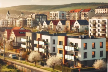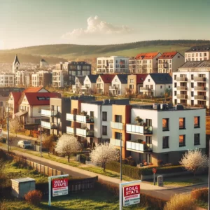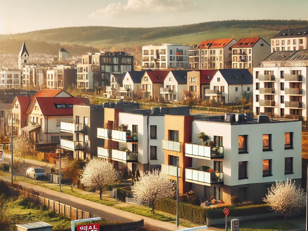 DALL·E 2025-04-04 07.25.17 – Modern real estate market trends in a Czech town in the Vysočina region. A scenic small city with traditional Czech architecture, mixed with new apart