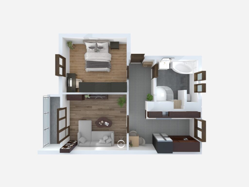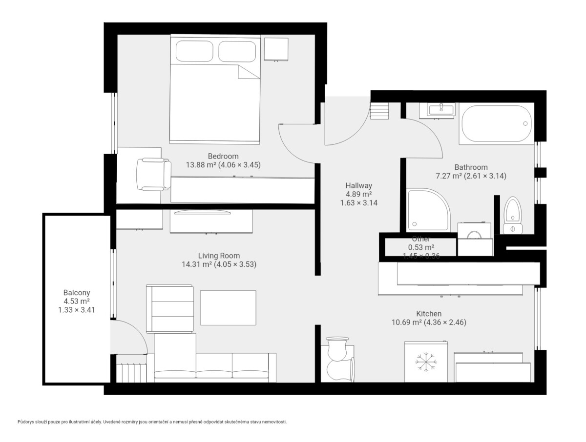 Dispozice je prakticky řešená a zároveň působí vzdušně a příjemně. Ze vstupní předsíně se dostanete do ložnice a kuchyně. Z kuchyně pak navazuje obývací pokoj, ze kterého je vstup na prostornou lodžii. Ta je ideálním místem pro ranní kávu nebo odpočinek po práci.