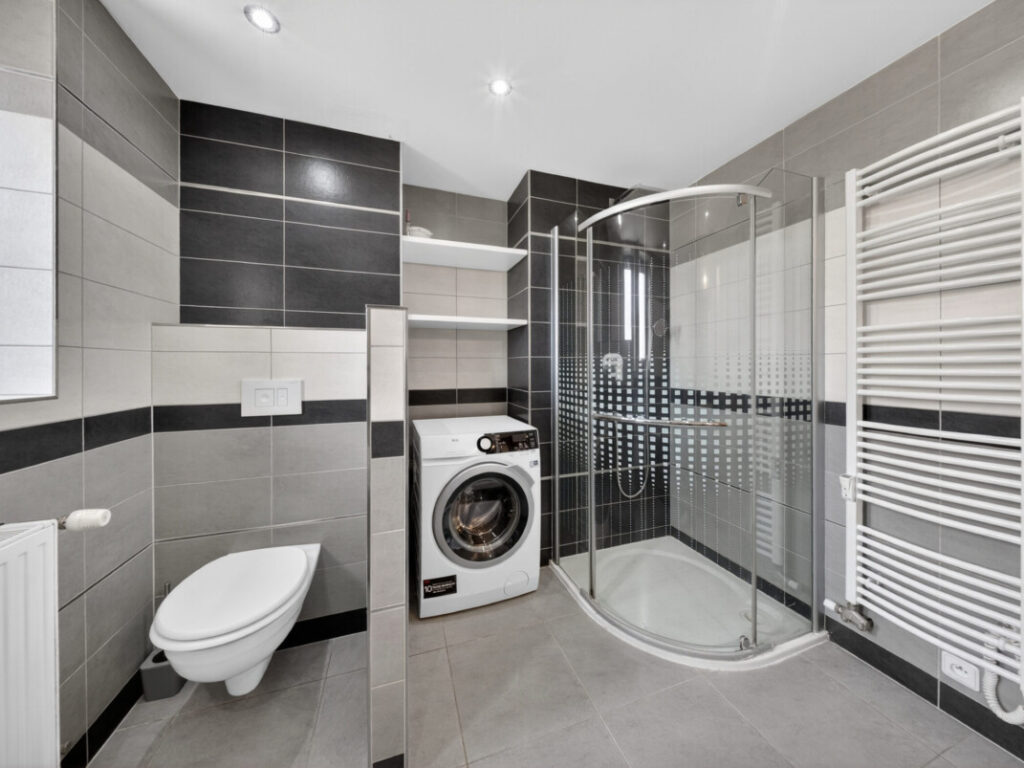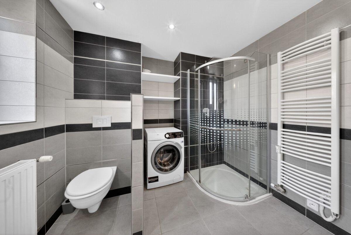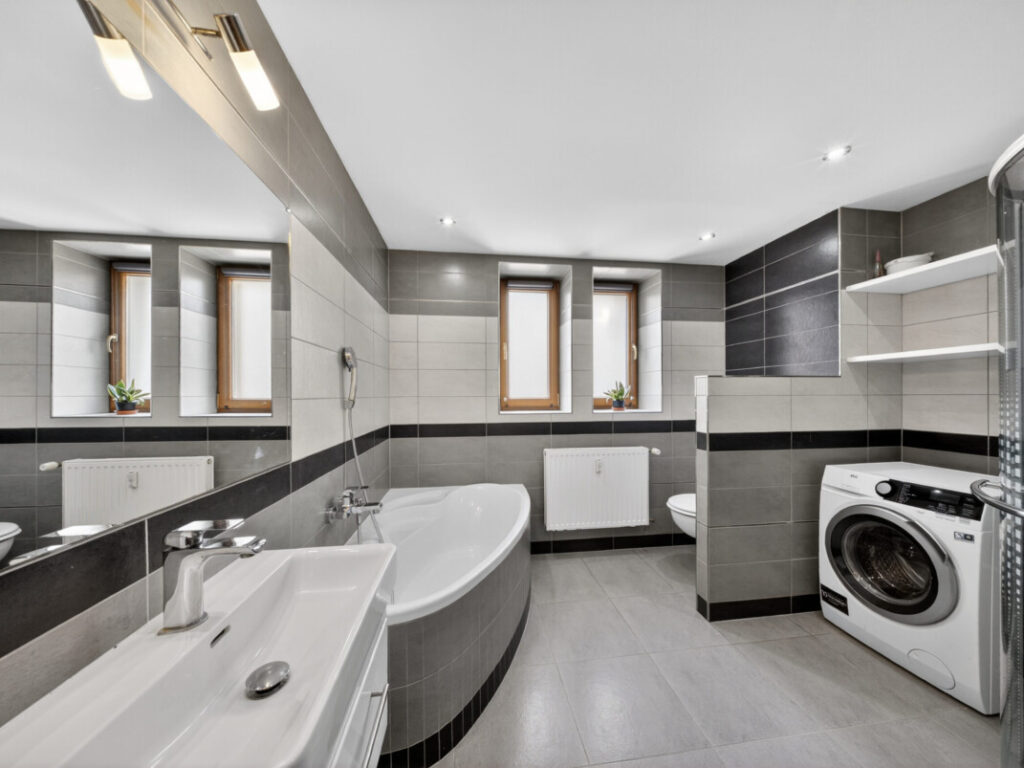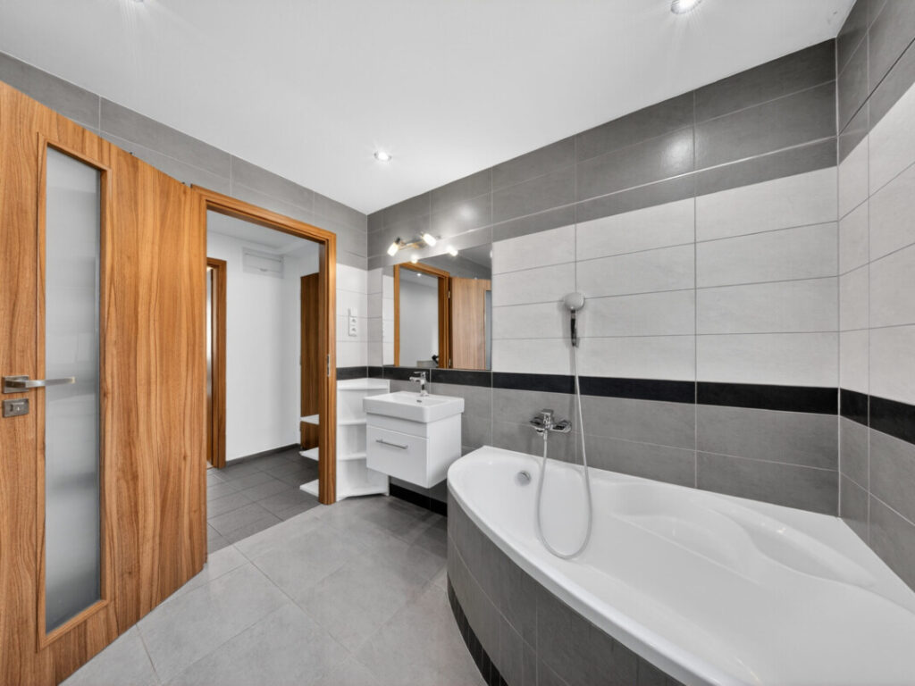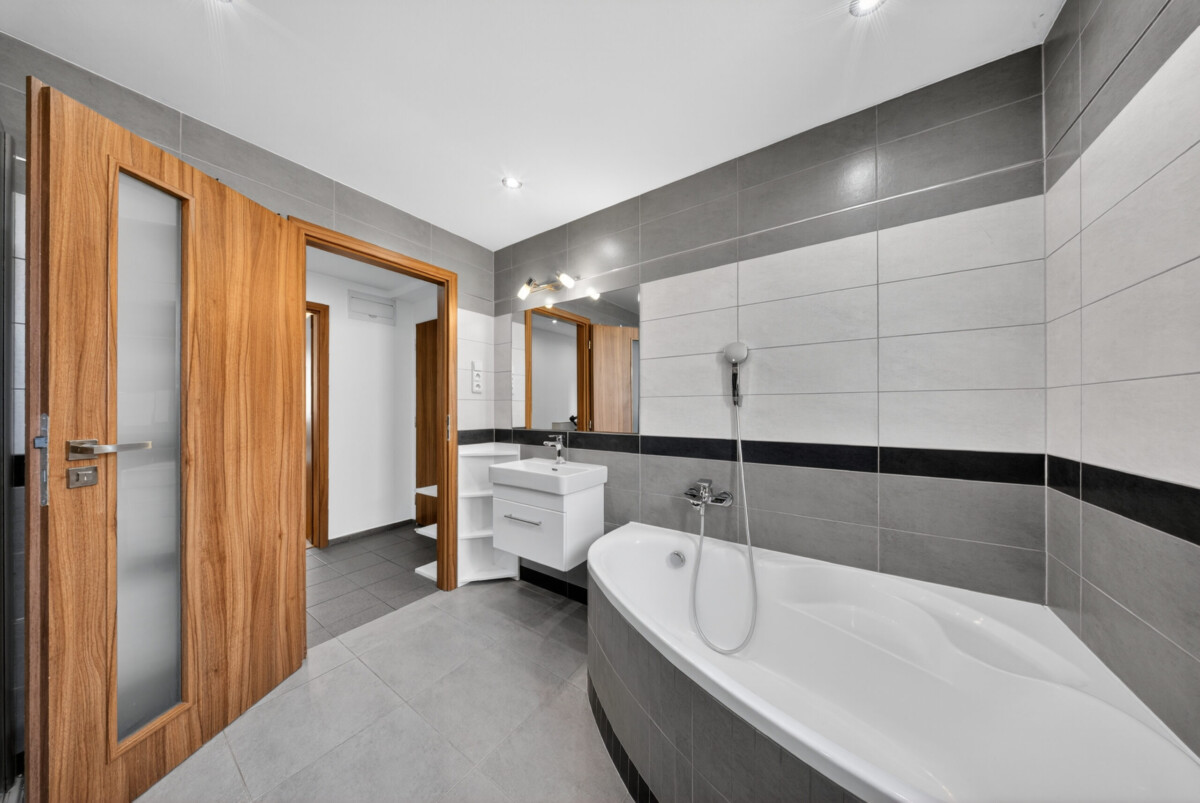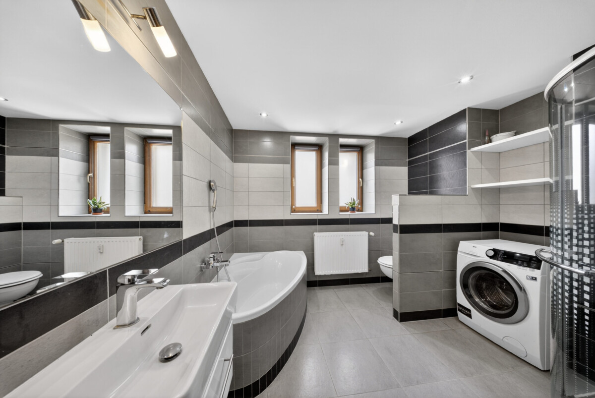 Velkým benefitem je prostorná koupelna, která nabízí jak rohovou vanu pro relaxaci, tak i sprchový kout pro každodenní využití. Samozřejmostí je toaleta.